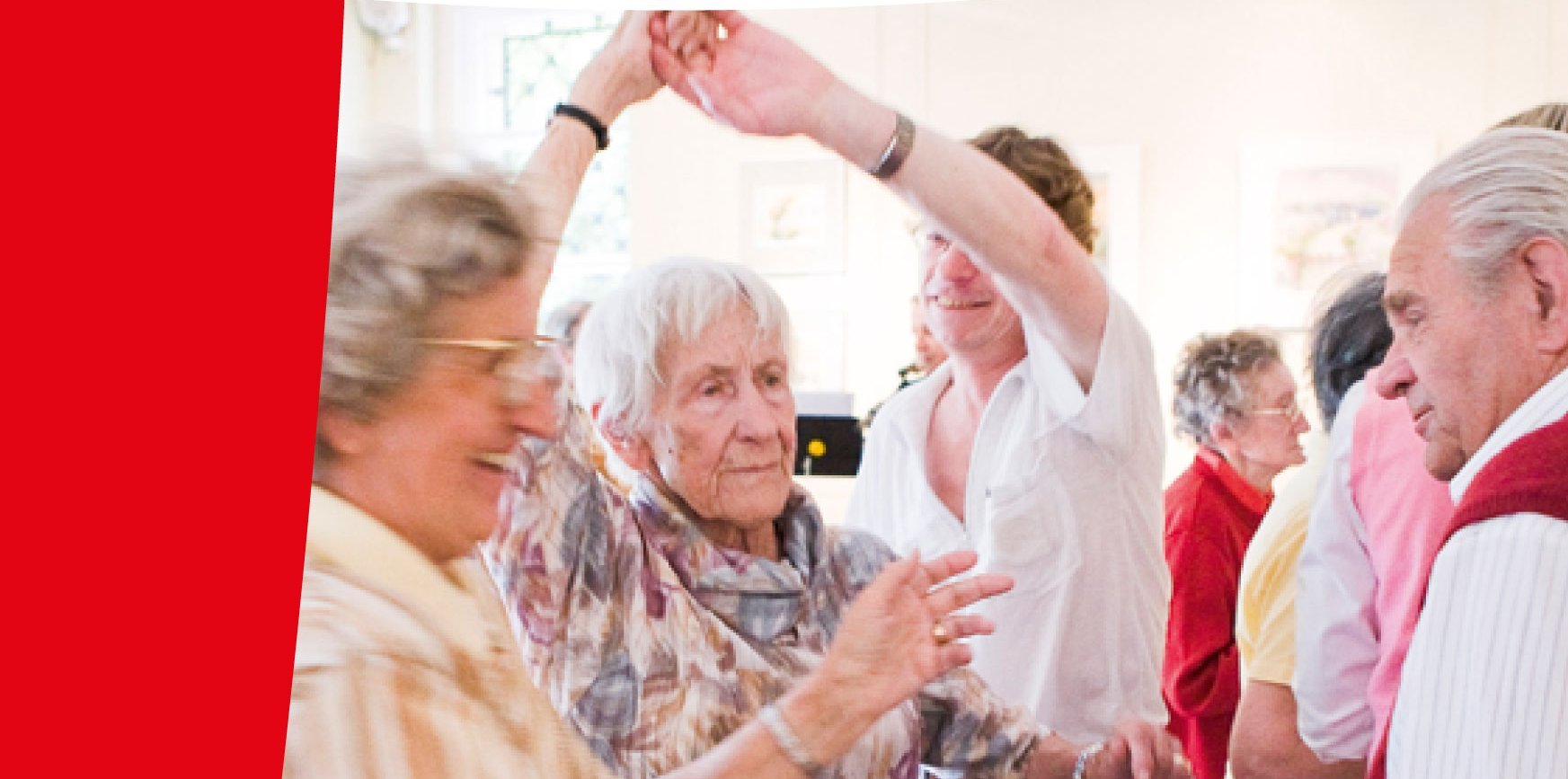 Cover des Berichts: eine lachende ältere Frau wird von medizinischen Helferinnen beim Stehen unterstützt